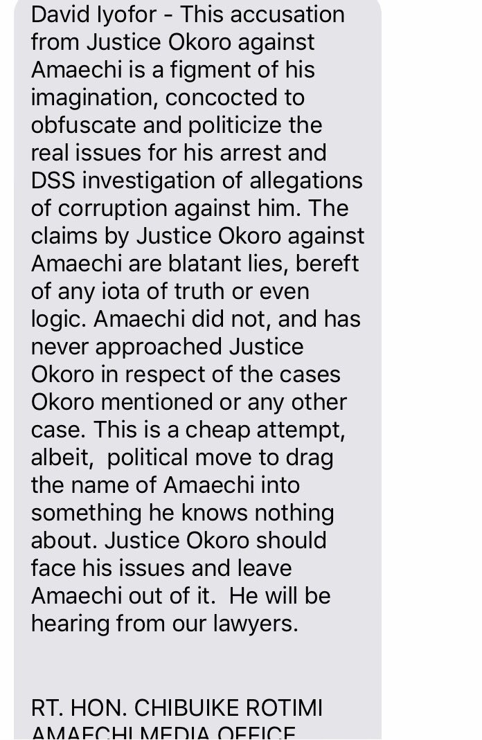 Hon Rotimi Amaechi has responded to Justice John Okoro's claims that he attempted to pressure him to rule in favor of APC A+ A- Print Email